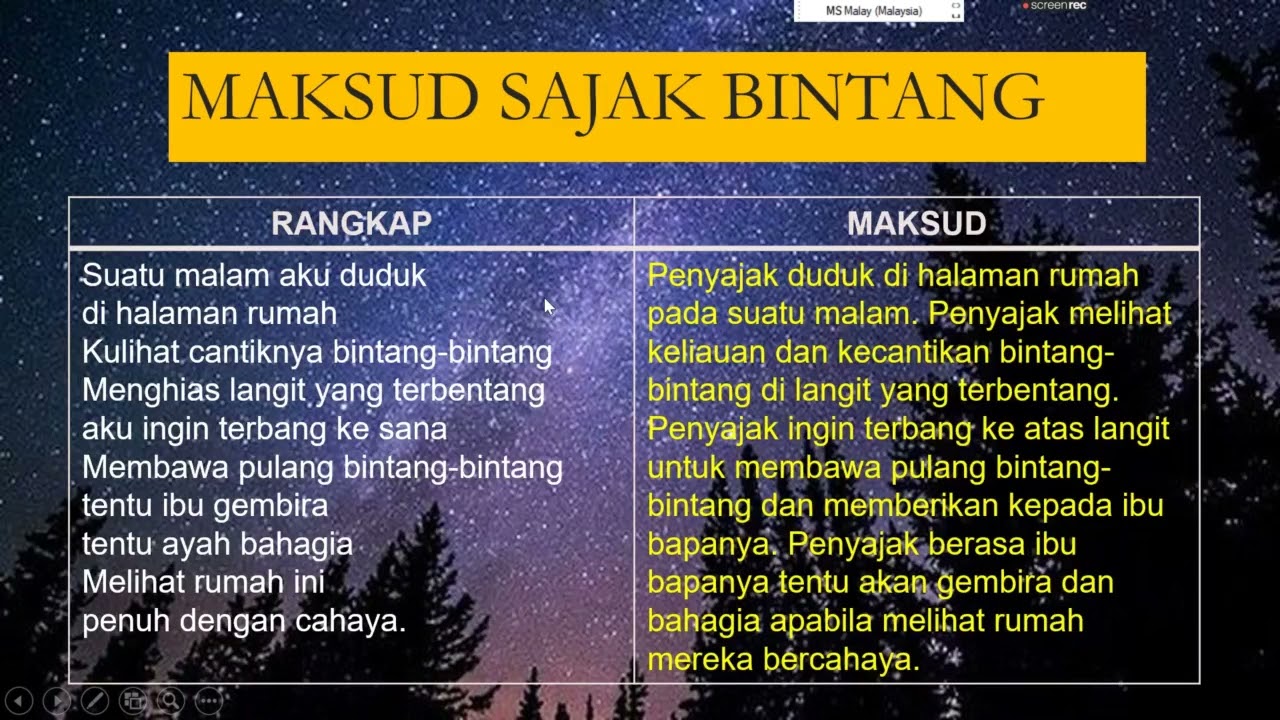 Sajak Bintang Objektif Pembelajaran. Sajak ini mengandungi dua rangkap. Rima akhir sajak berbentuk bebas.